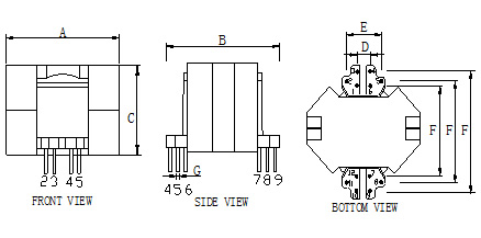 A長度 | B寬度 | C高度 | 安裝方式 | 針腳數(shù) | D腳距 | E腳距 | F排距 | G針徑 | 繞線槽寬 | ||